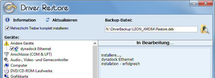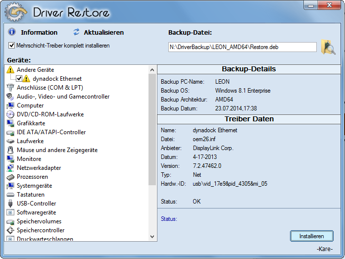 Wurde die entsprechende Restore.deb Datei eingelesen, werden die fehlenden Treiber automatisch markiert. Ein Klick auf die Schaltfläche Installieren installiert die fehlenden Treiber.