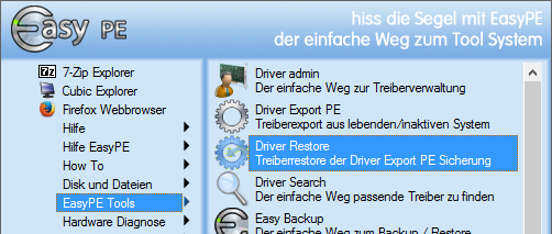 Zugehörige Seminare: Windows easy fix pro bzw. Virus easy defense pro mit praktischen Beispielen. Das Programm DriverRestore importiert mit DriverExportPE gesicherte Treiber, die im laufenden Windows System fehlen. Zum Importieren der gesicherten Treiber wird nach dem Start des Windows Systems das Programm DriverRestore gestartet. Das Programm DriverRestore befindet sich im EasyPE Menü in den EasyPE Tools.