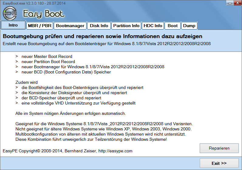 Zugehörige Seminare: Windows easy fix pro bzw. Virus easy defense pro mit praktischen Beispielen. Das Programm EasyBoot.exe dient zum Wiederherstellen der Bootsektoren und zum Wiederherstellen eines zerstörten Bootloaders. Für ältere Systeme wie Windows 2000/XP und Windows 2000 Server/2003/2003R2 Systeme verwenden Sie das Programm EasyNTBoot.exe.