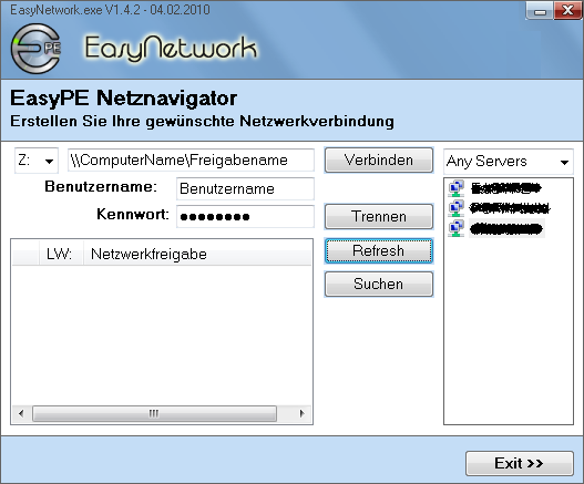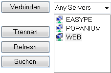 Wahl des ServersBeim Start von EasyNetwork wird zunächst das Netzwerk, vergleichbar mit dem Befehl Net View am Prompt, untersucht. Die vorhandenen Netzwerkinformationen liefert ein Computer, der als Browser fungiert. Die ermittelten, im Netz befindlichen Server, erscheinen in der Serverliste unterhalb des Drop-Down-Menüs Any Servers. Ist die Liste der verfügbaren Server zu lange oder zu unübersichtlich, In der dann erscheinenden Serverliste wird der zum Verbindungsaufbau gewünschte