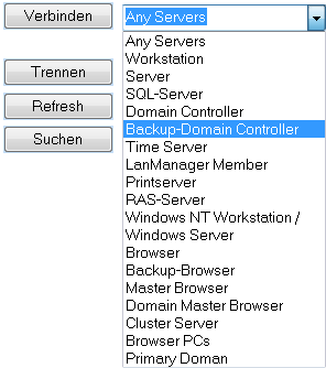 ServerfilterZunächst werden alle Server der Domäne bzw. der Workgroup im Netzwerk, die der Browser kennt, aufgelistet. Diese Serverliste kann mit Hilfe des Drop- Down-Menüs Any Servers (Combo-Box) eingeschränkt werden. Nach der Wahl der Servergruppe erscheinen nur noch die der Wahl entsprechenden Server.