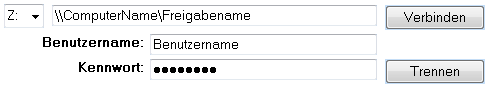 Eingabe der VerbindungsdatenDer lokale Laufwerksbuchstabe Die Freigabe (Computername & Freigabename) Der Benutzername Das Kennwort Sind alle Eingaben korrekt angegeben, wird die Verbindung mit Klick auf die Schaltfläche Verbinden hergestellt.