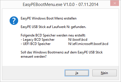 EasyPEBootMenu erstellt ein Legacy und ein UEFI Bootmenü auf dem EasyPE USB Stick.