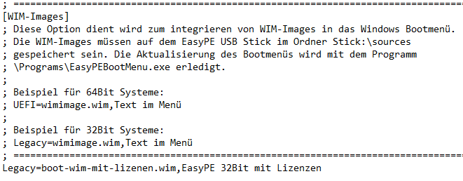 Eigene WIM-Images werden in der Datei EasyConfig.ini im Abschnitt [WIM-Images] eingetragen und mit EasyPEBootMenu in das EasyPE Bootmenü übernommen.
